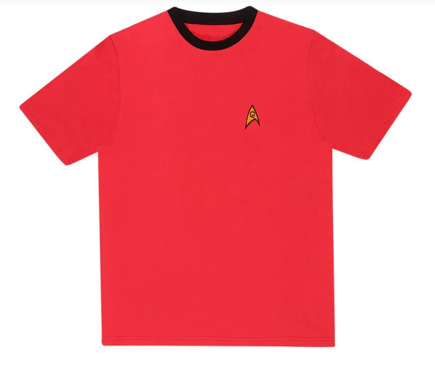 Na piersi logo sekcji inżynieryjnej, w której Montgomery Scott pełni głównego inżyniera na pokładzie statku USS Enterprise należącego do Zjednoczonej Federacji Planet.